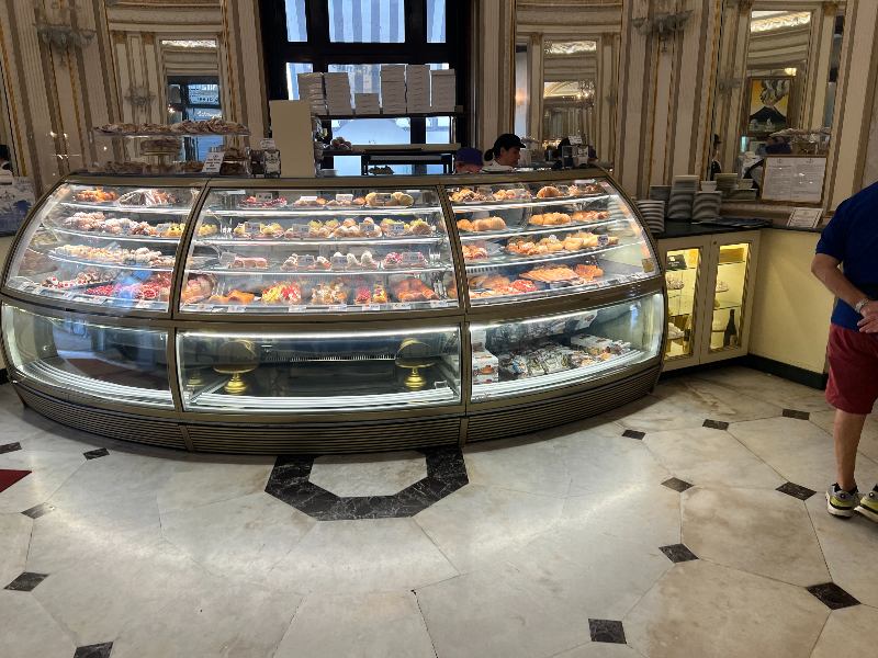 화장실을 이용하기 위해 카페 안쪽으로 들어가 보았습니다. 쇼케이스 안에는 다양한 디저트들이 진열되어 있습니다. 메뉴판으로 보다 실물로 보니, 주문할 걸 그랬나 또 약간의 후회를 해보았습니다. 화장실은 실내 안쪽으로 쭉 들어가서 지하로 내려가면 됩니다. 이탈리아는 숙소를 제외하고는 화장실이 깨끗한 곳을 찾아보기 힘든 것 같습니다. 그래도 급한 용무를 해결하면 좋으니, 카페나 식당 이용 시 꼭 화장실 다녀오세요!