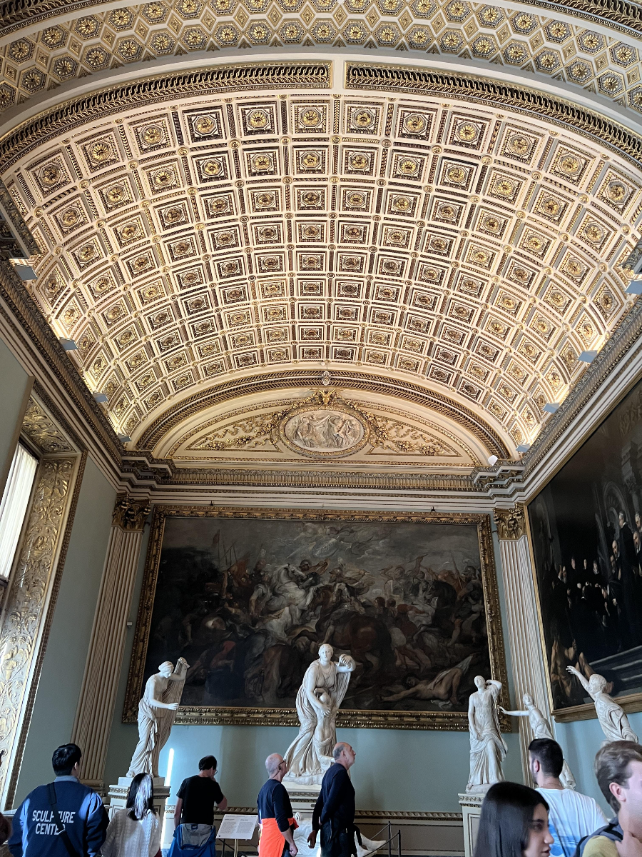 계단을 올라오면 이렇게 전시실들이 왼편에 시작됩니다. 좌우에 조각상들도 세워져 있습니다. 그리고 천장 쪽에는 인물화가 전시되어 있습니다.