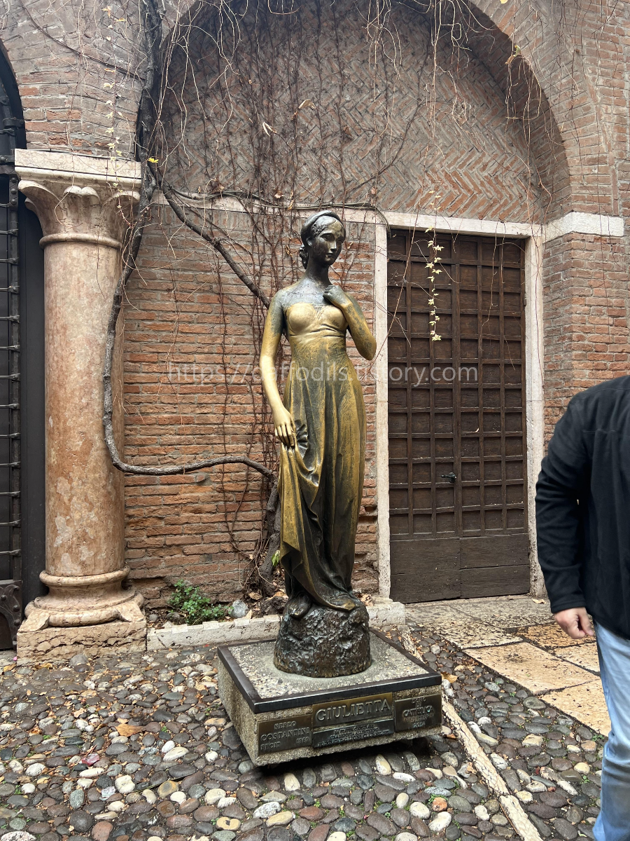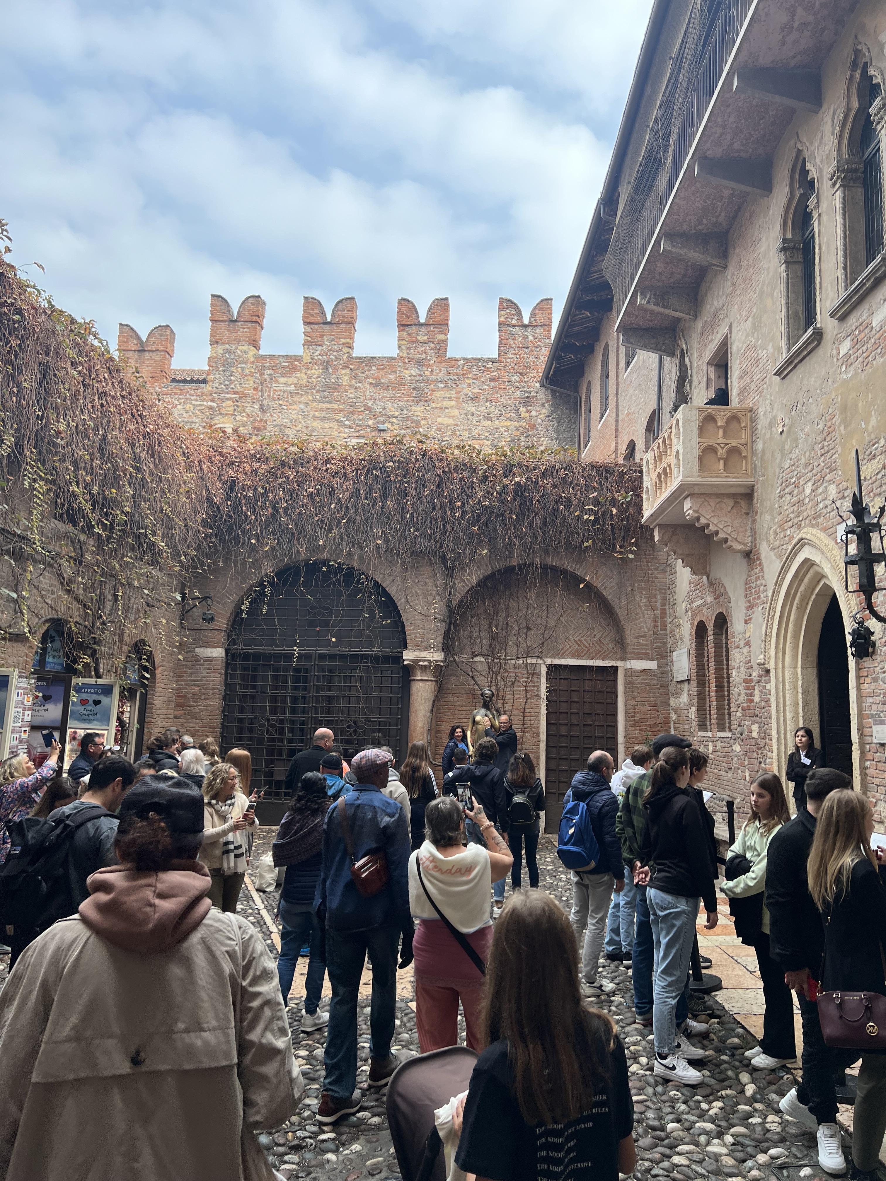 그렇게 안쪽으로 들어오면 또 그 안에서 인파가 몰려있는 곳이 있습니다. 바로 그 유명한 줄리엣 동상이 있기 때문입니다. 줄리엣의 가슴을 만지면 영원한 사랑이 이루어진다는 속설이 있어 많은 사람들이 이곳에서 줄리엣 동상에 가슴을 만진 채 인증 사진을 남깁니다!