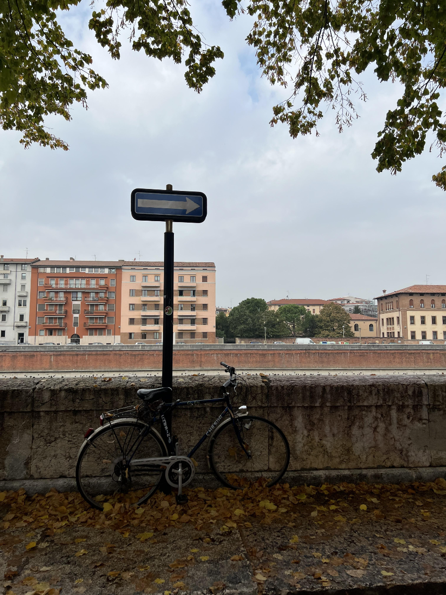 그렇게 걷고 또 걷다 보면, 아디제 강(Adige)이 나옵니다. 자전거가 정면으로 보이는 사진을 기준으로 오른쪽으로 가면 피에트라 다리(Ponte Pietra)를 보러 갈 수 있고, 왼쪽으로 가면 카스텔베키오 다리(Ponte di Castelvelcchio)를 보러 갈 수 있습니다.