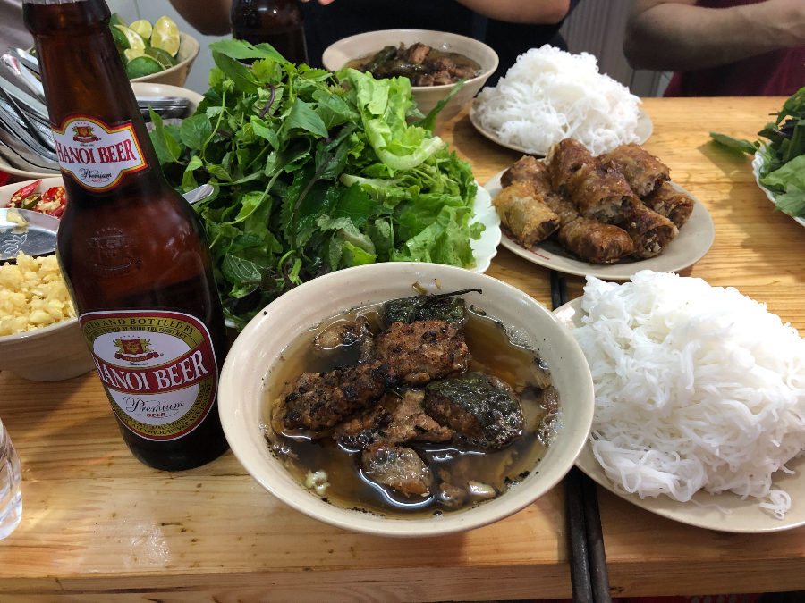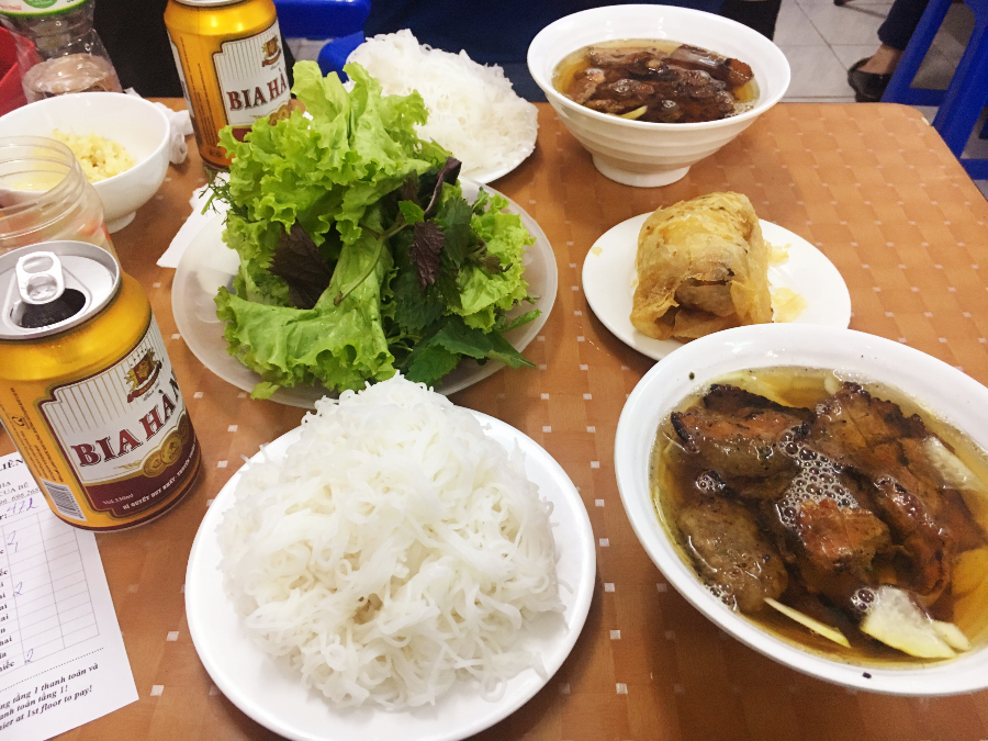 사람이 워낙에 많은 식당이라 그런지 손님이 들어가도 별로 신경 쓰지 않는 눈치입니다. 2층으로 올라가라고 해서 갔더니, 자리 없다고 3층으로... 3층으로 갔더니, 4층으로... 또 5층으로... 그렇게 비좁은 계단을 오르고 올라 5층에서 식사를 할 수 있었습니다. 앉자마자 배가 너무 고파서 주문부터 했습니다. 제가 주문한 음식들은 분짜 2개, 해산물 넴 1개, 하노이 비어 2병입니다.
